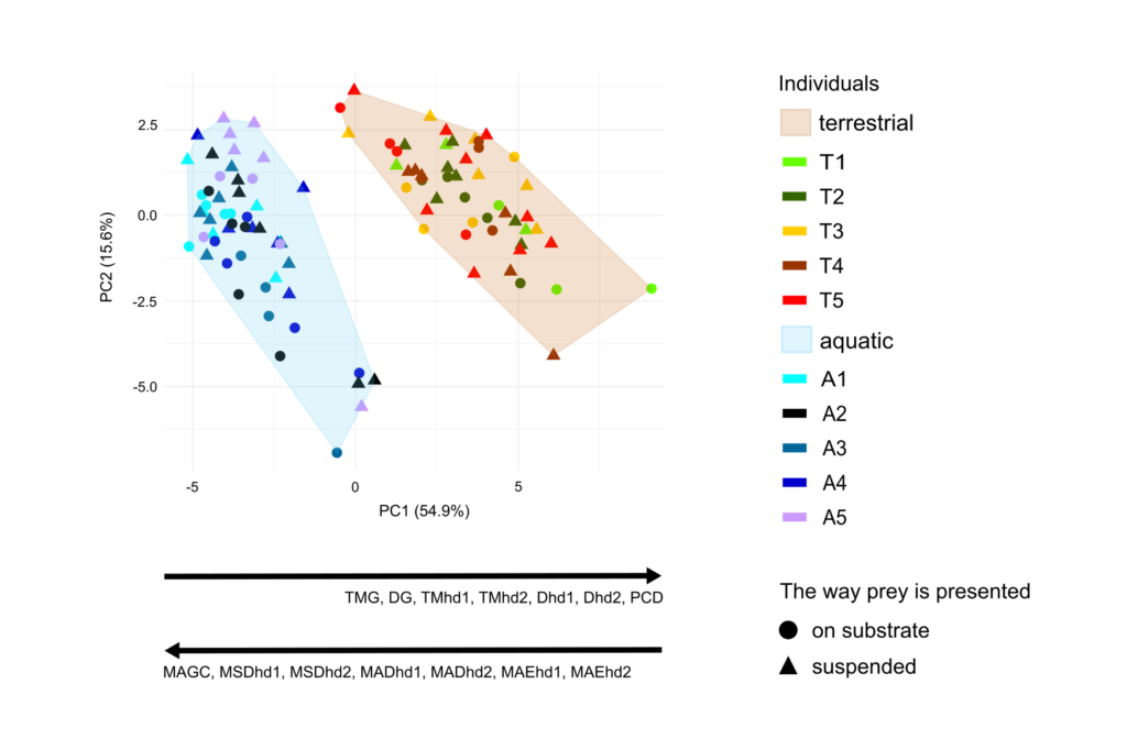 At the end, when aquatic and terrestrial data sets are combined, the effect of the way prey is presented is overridden by the larger differences between feeding in water and on land (see PCA). This suggests that the importance of accounting for prey presentation depends on the context and the level of analysis.