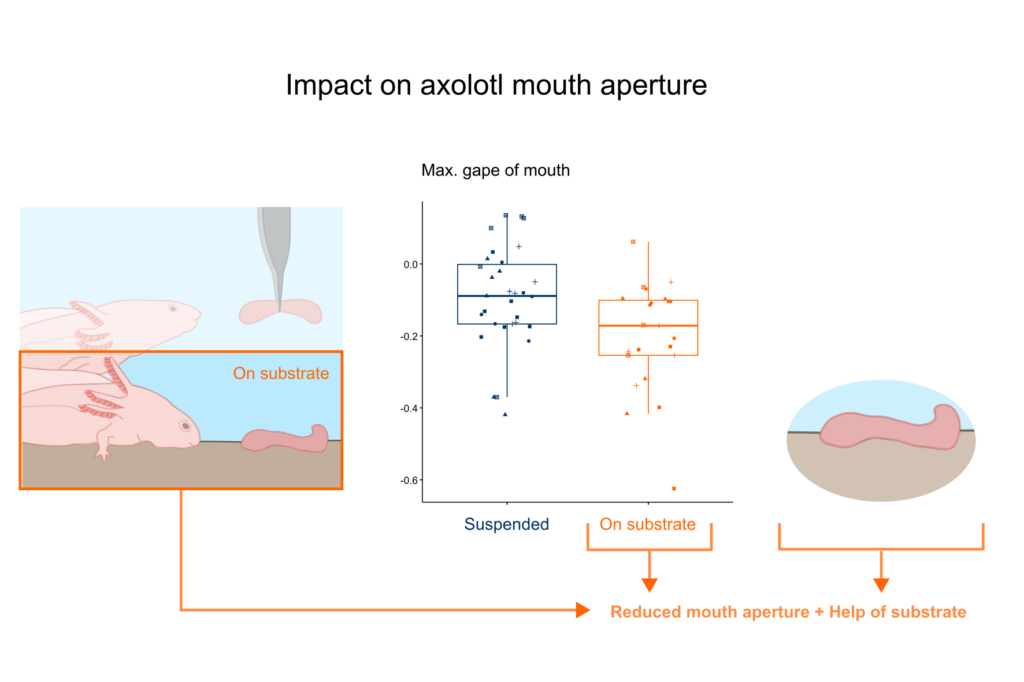 When prey was on the substrate, they opened their mouth less wide, which is another way to increase suction force. However, compared to opening the mouth quickly, reducing mouth aperture generate a force which drops off more quickly with distance. But they likely compensated using the substrate. Thanks to the substrate the space becomes relatively 2-dimensional which permits to concentrate the flow and double the distance from which prey can be successfully captured.