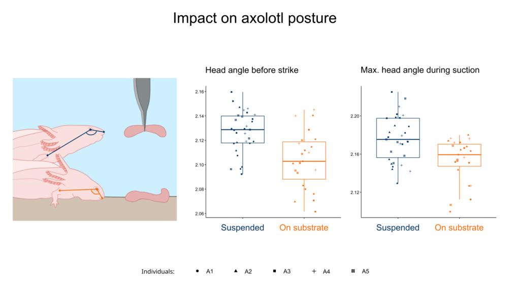 The head angle before strike and the maximum head angle during suction was higher when prey was held with tweezer for the simple reason that prey was suspended above the axolotl, unlike when it rested on the substrate.