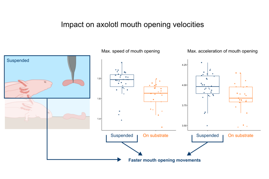 When prey was held with tweezers, axolotls opened their mouth faster. This likely helped them reach peak flow velocity more quickly, a known way to increase the suction force.